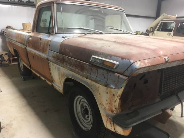1968 Ford F-100. Factory air, auto trans, power steering. Engine will run, but truck is not driveable. Minor rust, overall solid. Good candidate for restoration. Grille is straight. Have an extra hood. Have disc brake setup from a later model F-150 to go with it. 360 motor. Bought new in Clarksville in 1968. Have original book.