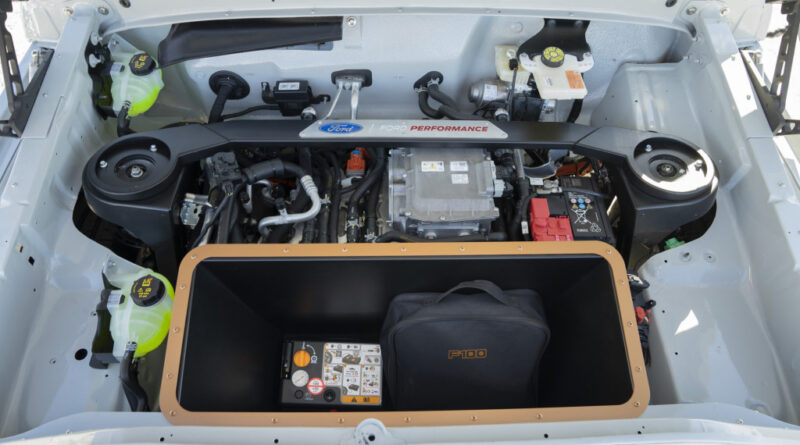 Ford built the custom F-100 in partnership with MLe Racecars. It sits on a custom frame and features a new storage area under the hood, made possible by space that was made free by removing the internal-combustion engine.