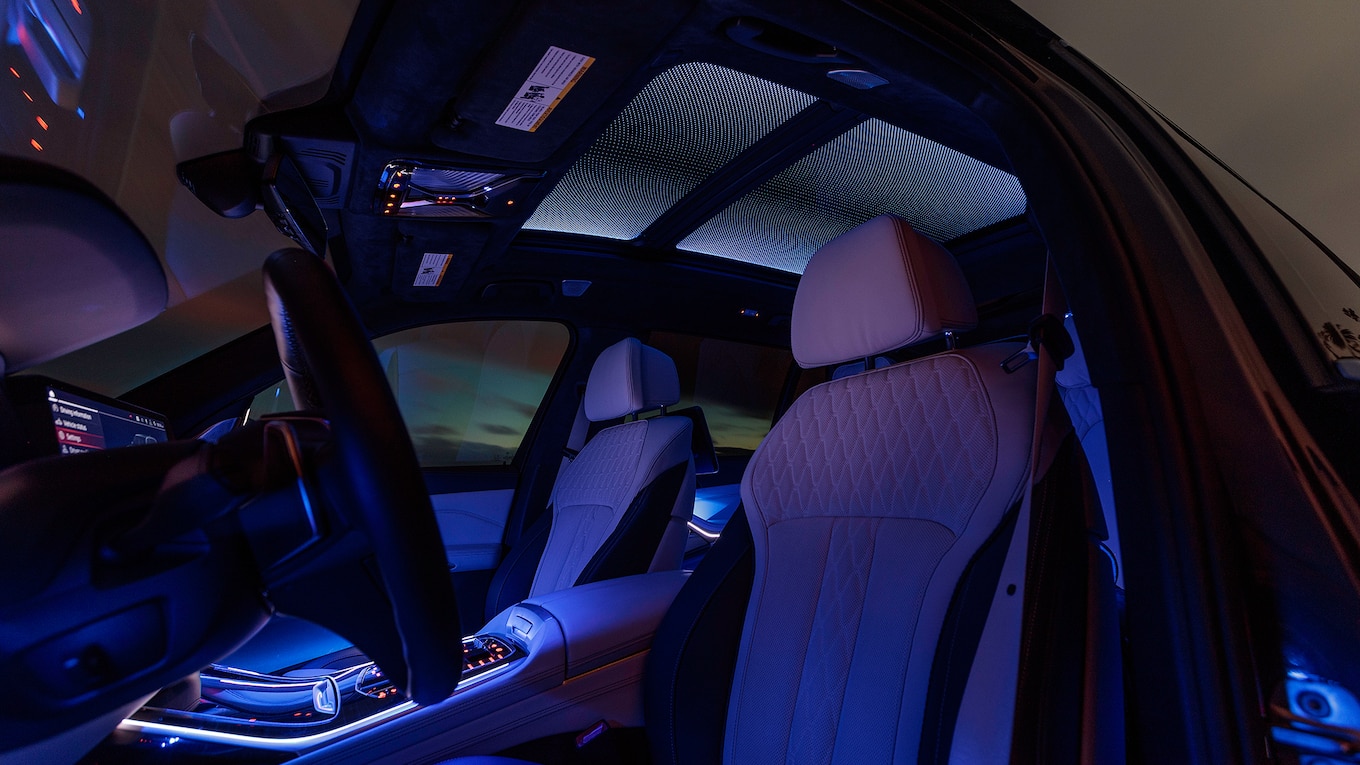 The $750 Panoramic Sky Lounge LED roof is a large two-panel moonroof that can be illuminated in six colors. The only thing missing is a seventh option that automatically changes the light from one color to another. We’ve seen the colorful moonroof tech on the 7 Series, but it makes even more sense on a three-row SUV like the X7.