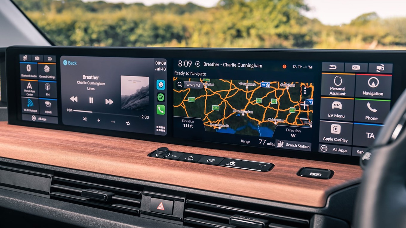 The welcome break with current Japanese design trends continues inside the Honda e. With gray woven cloth seats, satin-finish mid-tone wood on the dash and standalone center console, brown contrast stitching, and brown seat belts, this Honda cabin has a distinctly Scandinavian vibe. It’s a Scandinavian vibe with a high-tech edge, however: No fewer than five high-def screens are arrayed across the full width of the dash. The outer two display images from the rearview cameras on the doors, the 8.8-inch one in front of the driver gives all relevant vehicle information, and the other two—a pair of 12.3-inch LCD touchscreens—handle all the infotainment chores.
