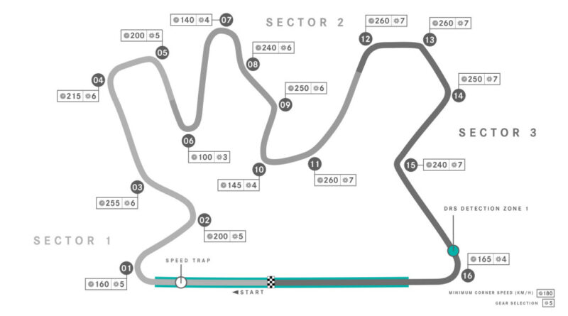 There are 16 corners in total (10 right-handers and six left-handers) and the main straight is almost a fifth of a lap, with the end of this straight being the only DRS zone. The slowest corner on the track is Turn 6, at around 60 mph, with the fastest being Turn 13, taken at 160 mph.