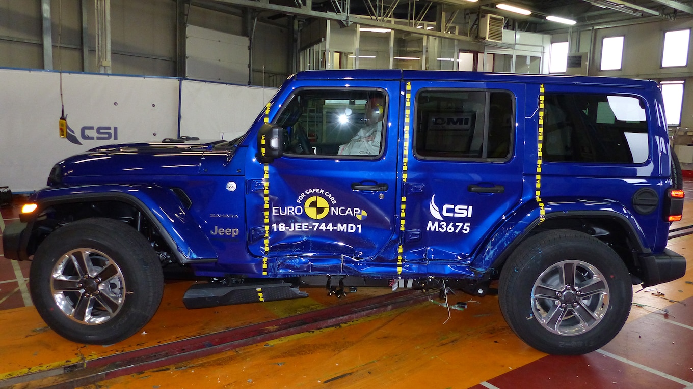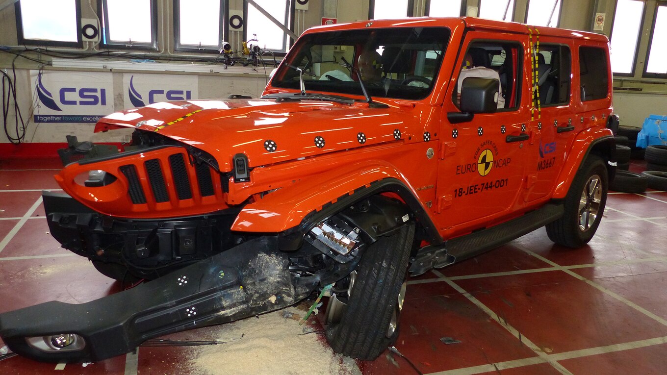 That’s not a lot to go on, but we can look abroad for more clues. Jeep also sells the Wrangler in Europe, where it’s been subjected to nearly the full battery of Euro NCAP crash tests. Euro NCAP tested both full-frontal and partial offset front crashes and gave the Wrangler a combined score of 50 percent. This reflected a full-frontal score of 5.7 out of 8 possible points, a partial overlap score of 3.9 out of 8 points, and a side impact score of 8 out of 16 points (a side-impact pole test, which simulates sliding into a tree or telephone pole, was not performed).