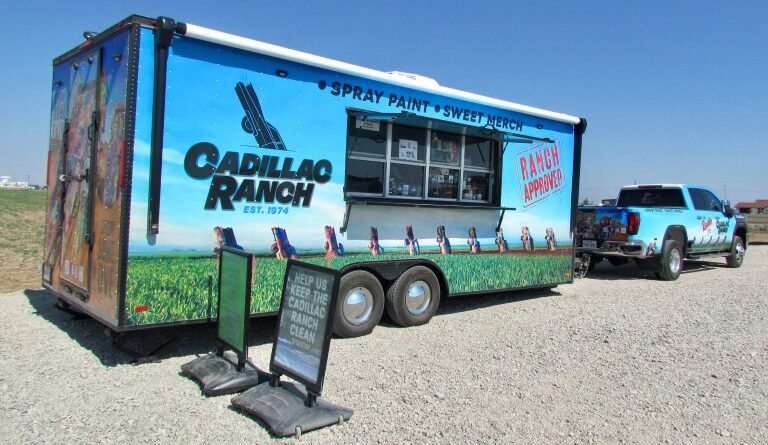 There were noticeable changes when I last visited Cadillac Ranch on a weekday back in mid-June. Changes included a new access gate, an entry area covered in gravel and occupied that day by a food truck and a souvenir trailer. Positioned near the row of classic Caddys, each carefully planted into position in the Texas Panhandle farm field since the mid-1970s, were garbage cans, presumably placed so people who had emptied aerosol spray-paint cans wouldn’t simply toss them onto the ground.