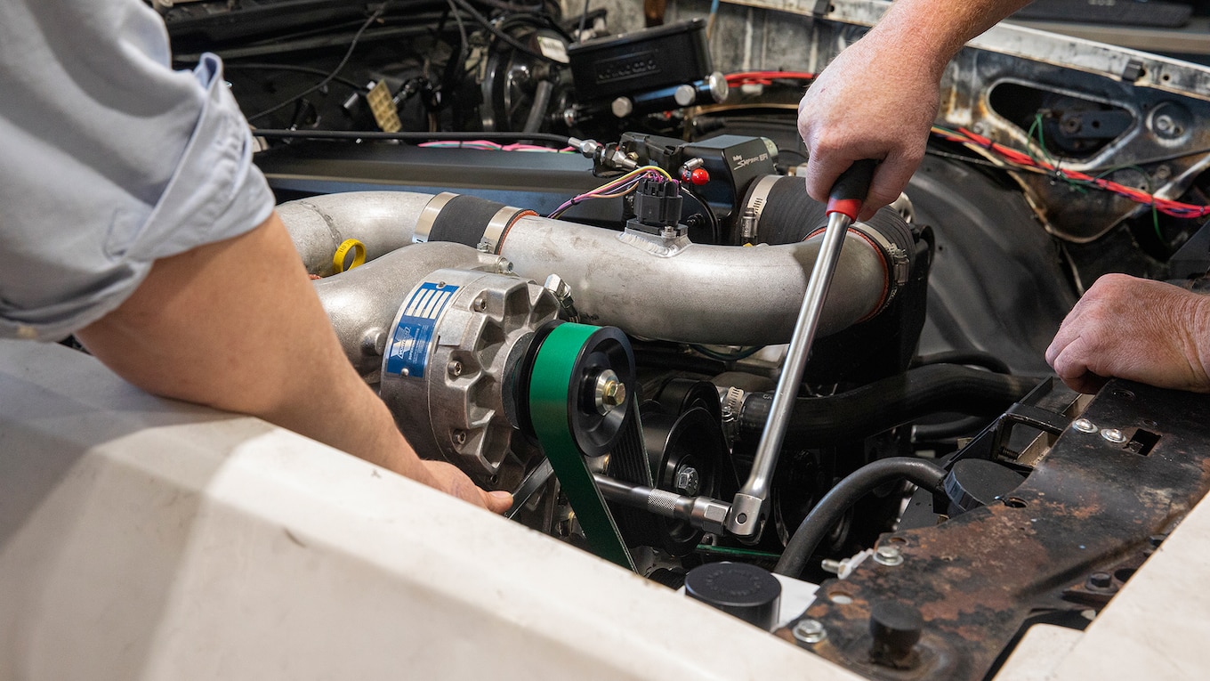 This basic non-intercooled kit includes a standard 6-inch crank pulley (PN: 4MA018-041) and 3.60-inch drive pulley (PN: 2A031-360; $111.99). With this combination on the low-compression LS1, it made between 5 and 7 pounds of boost; a 7.8-inch crank pulley (PN: 4MA018-061; $156.99) and 3.12-inch drive pulley (PN: 2A031-312; $11.99) were added to make some additional boost.