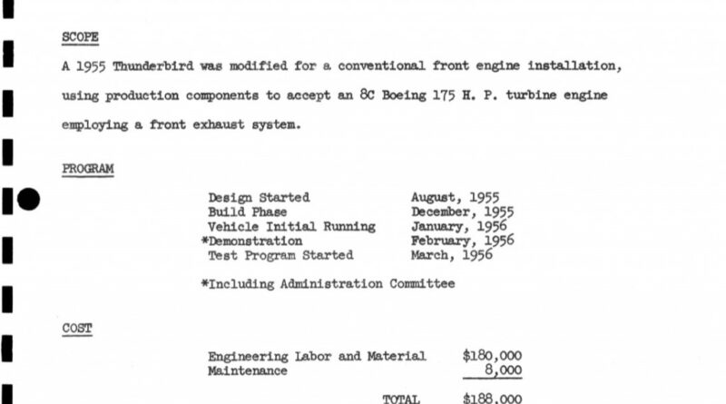Ford archivist Ted Ryan posted a photo of the turbine-powered Thunderbird and testing notes on Twitter on Tuesday. They’re artifacts from a time when automakers considered turbines as a possible alternative to conventional piston engines.