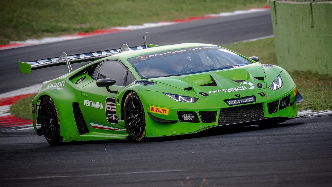 Rain would stop play after just seven laps in the lime-wedge GT3 Evo. But I’d learned enough to understand exactly what Galante meant: Quick lap times don’t come as easily in this car as they do in the Super Trofeo. Trusting the downforce and the mechanical grip through fast corners is one thing, but the other challenge is in the slower corners, where the GT3 Evo demands absolute precision and consistency in terms of the line on corner entry, how and where you get on and off the brakes, where you clip the apex, and when you get back on the gas. It’s absolutely critical to find the right balance, to get the car to rotate just enough to stop the front end pushing when you get back on the gas. Get it wrong, and you’ll feel the front tires chattering as the nose runs wide, compromising your corner exit speed. And from there, your whole lap goes up in smoke.
