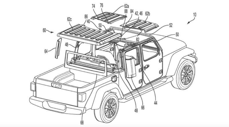Removable roof panels are great, until you have to find a place to store them. A September 2021 filing with the United States Patent and Trademark Office (USPTO) indicates Jeep may be working on a solution for the Gladiator.