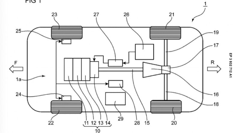 Accompanying drawings show a rear-wheel-drive vehicle, with what appears to be a transaxle, as well as a version with electric motors powering the front-wheels. Working with the rotary engine, they would give this hypothetical vehicle all-wheel drive. The document specifies in-wheel motors for this application, something that companies like Lordstown Motors have experimented with but not successfully commercialized yet.