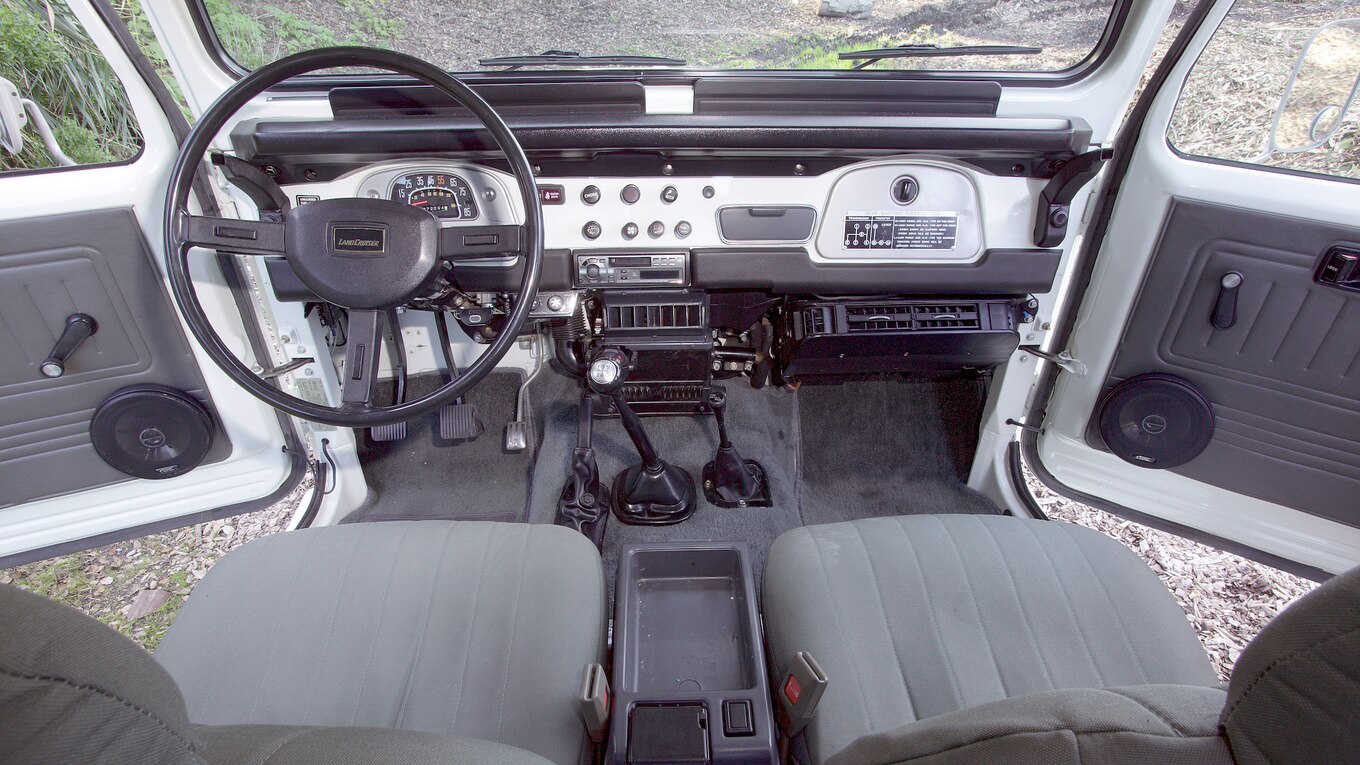 The 40 launched with a 125-hp 3.9-liter inline-six, loosely patterned after General Motors’ inline-six of the day. That was replaced by a 135-hp 4.2-liter six, which we sampled on this drive. Models initially came with a three-speed manual transmission, but four-speeds later replaced it. Our example, a near-stock 1983 model restored by Land Cruiser-specialist TLC (with mild suspension modifications, slightly oversize tires, and a transmission swap) is incredibly rare—it was the last year the model would exist in the United States. This is essentially the Land Cruiser that Toyota offered for a decade and a half, and its body style and interior amenities are near-identical to those of its 1970s kin. (The model cost $2,995 when it first went on sale in America.)