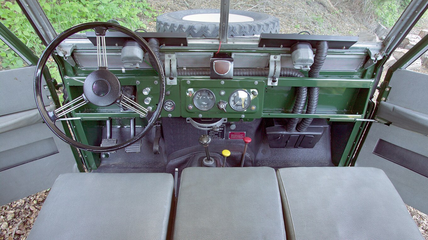 This restored 1966 Series IIA, part of Land Rover’s own collection, took some time to get used to. But once adapting to the transmission (its non-synchronized first and second gears require double-clutching, and first is where third is today: straight up) and getting to know the controls, the Series IIA is a charmer. The headlight controls are on a collar that surrounds the ignition. There’s a push-button start. Low-range and four-wheel-drive controls are operated with floor-mounted red- and yellow-knobbed levers.