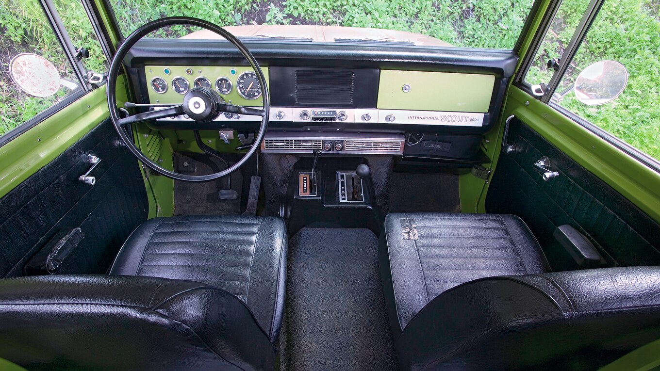 William Allfrey’s father-in-law worked for International from 1952 to 1982, helped set up the West Coast Scout dealership infrastructure, and served as product manager of the Scout program. It’s no surprise a fondness for Scouts runs in his family. Allfrey’s 1970 Scout 800A is a daily driver with the removable Traveltop and optional V-8 engine. It also features several of the options available that year: a chrome front bumper, black vinyl front bucket seats, and dual 10-gallon fuel tanks. The doors are padded, wires are hidden from view, and the layout looks cleaner and better organized than those of the Land Rover and Toyota. But it’s a far cry from luxury. Climate control, for example, is limited to “heat” or “defrost.”
