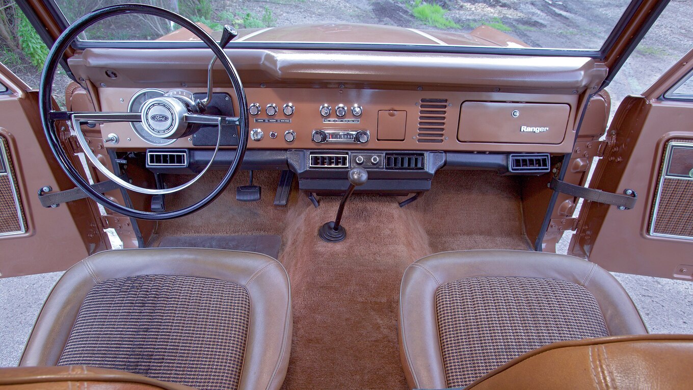 While the others have plain vinyl or drab cloth seats, the Bronco uses stylish cloth for the soft seats, with tweed inserts. Its dash is simple, and the skinny steering wheel is large in diameter. The inside is warm and welcoming, as opposed to the more truck-like interiors of the day. It reflects the transition these vehicles were in the process of making—from work trucks to off-roaders to SUVs.