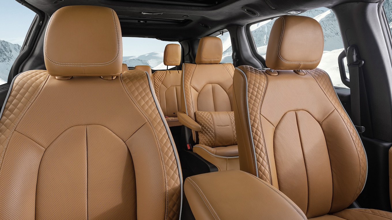 For the Pinnacle’s nearly $55K sticker price you get standard all-wheel drive (a new-for-2021 option for the Pacifica lineup), quilted Caramel Nappa leather seats, lumbar pillows for the second-row captain’s chairs, an exclusive center console design with Caramel accent stitching and dual-level storage, a unique instrument cluster with Mid-century Timber Hydro faux wood bezels, black suede headliner, and Satin Chrome switchgear and interior trim. On the outside, the Pinnacle is distinguishable by its unique 20-inch wheels, grille surround, moldings, and badging all finished in Platinum Chrome.