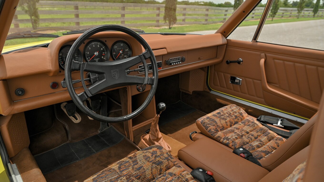 According to RM Sotheby’s, where you can find chassis 914.233.0011 for sale, was built for the sister of Porsche executive Ferdinand Piëch—the architect of the Volkswagen Group’s massive expansion, and the force behind such wild cars as the Bugatti Veyron and Volkswagen Phaeton. She specified the car in this yellow tone, with an interior that combined chestnut leather with a “paisley”-patterned seat. The aesthetics are, uh, a period curiosity, but they’re original.