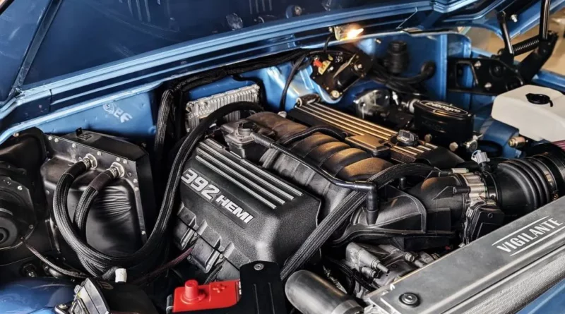 Vigilante also installed a high-density aluminum radiator, a brushless electric fan, and a powder-coated stainless steel fuel tank. A custom exhaust system incorporates Mopar high-flow cast iron headers and Borla stainless steel mufflers.