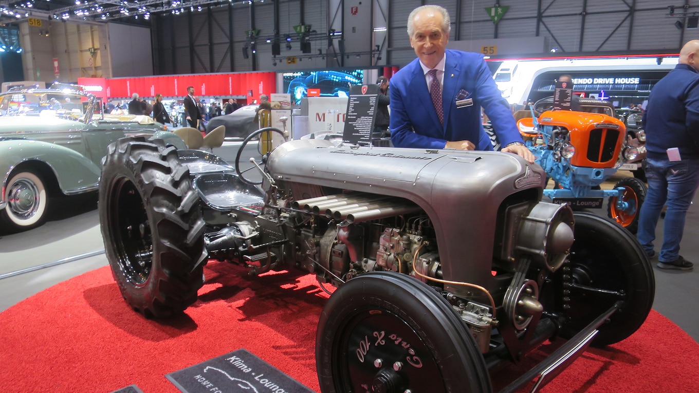 That dapper dude in the bright blue blazer is Fabio Lamborghini, company founder Ferruccio’s nephew. To mark the occasion of his late uncle’s 100th birthday (April 28, 1916), the company built 40 Centenario cars (which we covered extensively), and it also built five tractors like this one—which we never saw until this Geneva show. (You know, of course, that Ferruccio’s successful tractor business funded the startup of his supercar concern.) Priced about like a Huracán, each is a work of art, finished in “metallo nudo” paint, which you can probably translate. The 2,193cc inline-three engine features an elaborate air-cooling system with a fan that looks like a turbine in front. And at least on these remakes, the six parallel pipes serve alternating purposes: one intake, the next exhaust. There must be some inadvertent exhaust-gas recirculation going on there. It even includes what looks like a fragment of an original license plate from Ferruccio’s home region. Super cool.